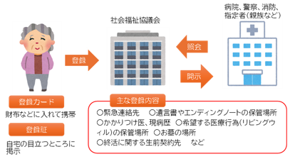 緊急連絡先や希望する医療行為などの情報を練馬区に無料で登録します。判断能力の低下やお亡くなりになった時に、警察や病院、事前に指定した方からの照会を受け、練馬区社会福祉協議会権利擁護センターほっとサポートねりまが情報を開示します。