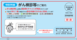 がん検診等の受診には受診券(チケット)とマイナンバーカード等(住所と生年月日を確認できる書類)が必要です。