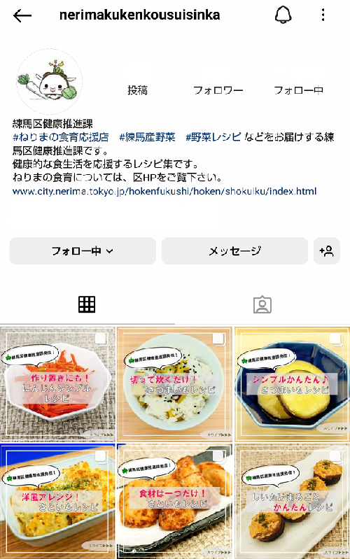 このInstagramでは、季節の野菜を使ったレシピや、ねりまの食育応援店が提案するレシピ等を投稿しています。