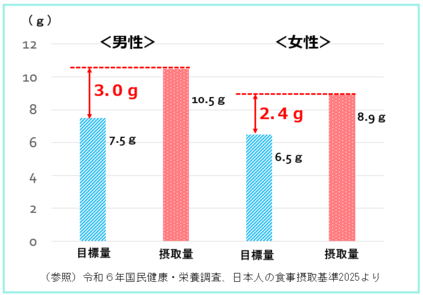 日本人の食事摂取基準2025では、1日の食塩の摂取量を男性で7.5g未満、女性で6.5g未満にすることが目標とされていますが、目標量と私たちが実際に食べている量を比較すると、男女ともに、摂取量が目標量を上回っています。