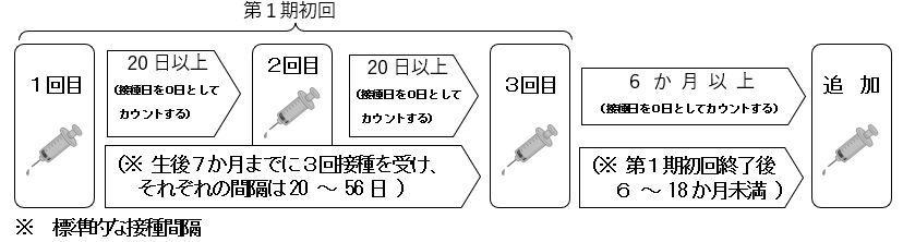 第1期初回 3回(生後2か月から7か月までの間に開始し、20日から56日までの間隔をおいて3回接種)