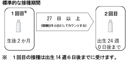 1回目の接種期間は、出生6週0日後(標準的な接種開始は生後2か月)から出生14週6日後までです。