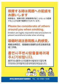 区では、受動喫煙防止啓発チラシおよびステッカーを作成し、区内薬局等で配布しています。