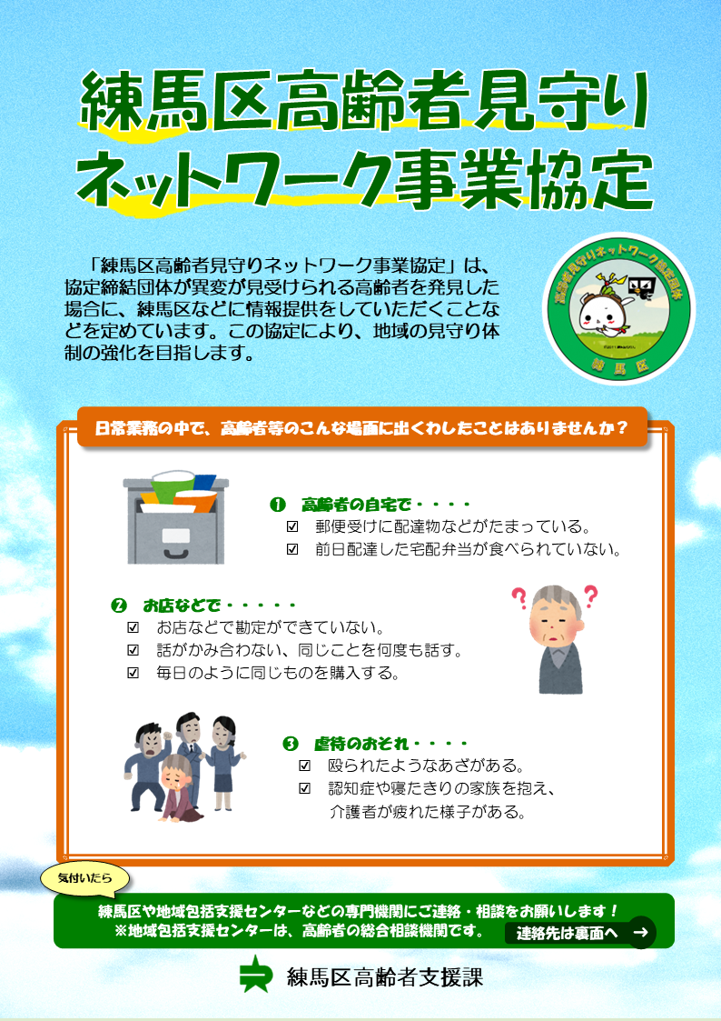 練馬区では、民間事業者や団体との間で、「高齢者見守りネットワーク事業協定」を締結しています。この協定は、ひとり暮らし高齢者などを地域で見守ることを目的としています。