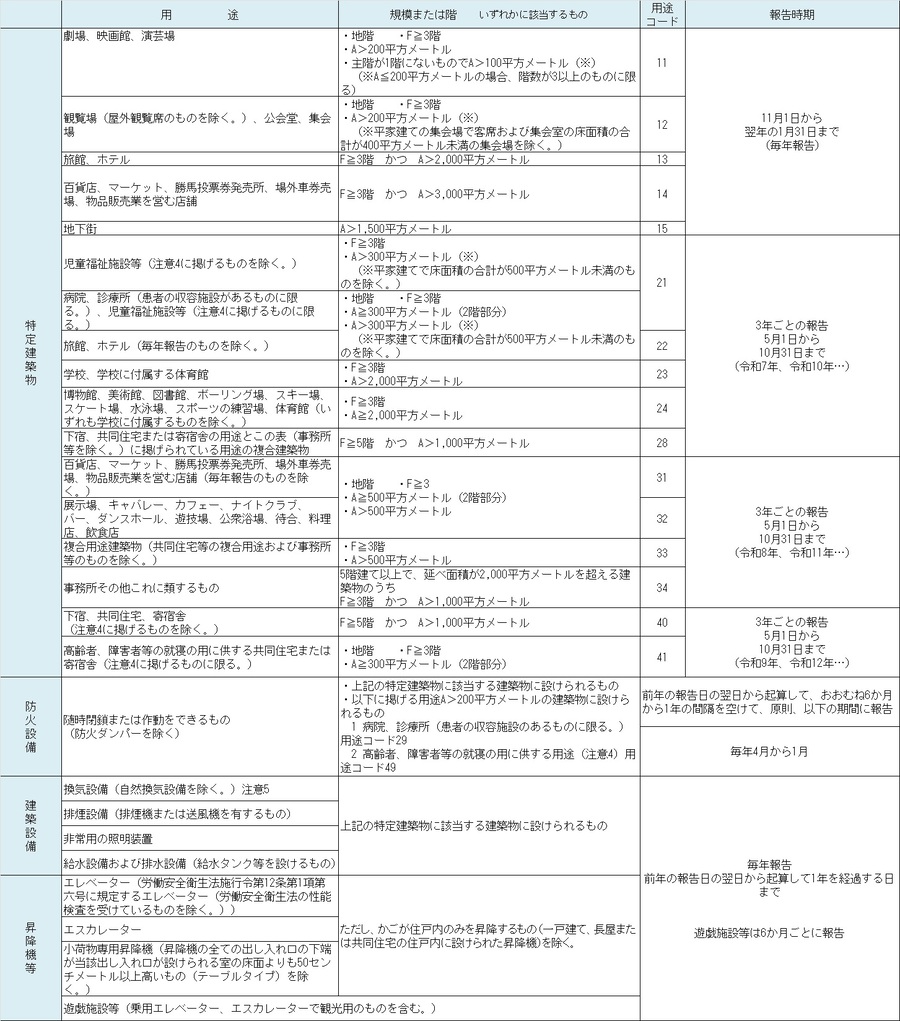 注意3:共同住宅(高齢者、障害者等の就寝の用に供するものを除く。)の住戸内は、定期調査、検査の報告対象から除かれます。
