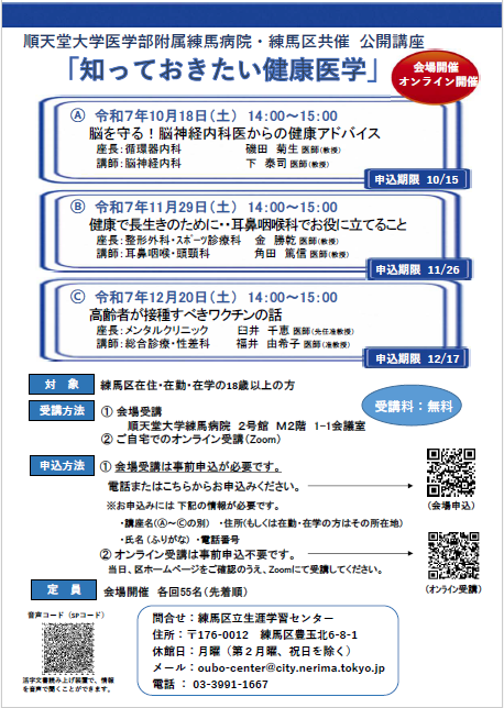 当日こちらから受講してください。→順天堂大学練馬病院ホームページ(https://hosp-nerima.juntendo.ac.jp/news_all/events.html(外部サイト))