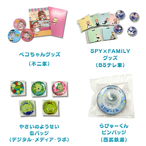 ペコちゃんグッズ、SPY×FAMILYグッズ、西武鉄道グッズ、やさいのようせいグッズなど