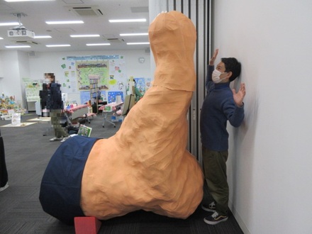 平和台児童館「つ、つぶれる~」2メートルを超える巨大な足を、みんなで新聞紙を貼ってつくりました!横に立って写真を撮ると、つぶされそうなシーンが撮れます。