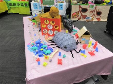 北町児童館「虫の世界」小さなダンゴムシやアリを巨大化して再現し、下にはのぞいて楽しめるアリの巣も作りました。