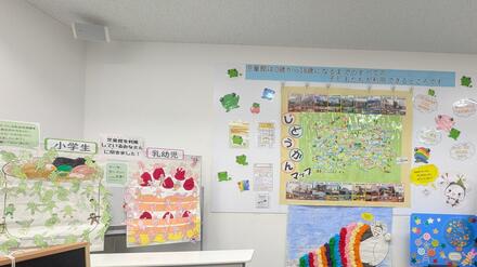 児童館を利用しているみなさんに、テーマにちなんで「大きくなったらやりたいこと」「小さくなったらやりたいこと」を人型の紙に書いてもらい、大きな食べ物の周りに展示しました。