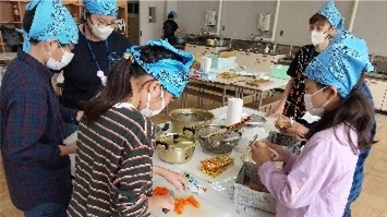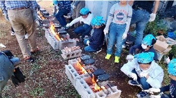 豊玉・開進地区では、南町小学校にてキャンプに向けて、かまどでの火おこし、飯ごう炊き、カレー調理等を行いました。