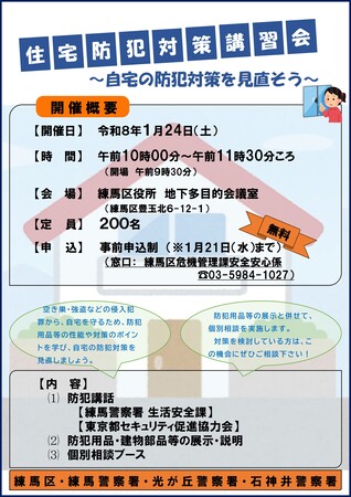 空き巣・強盗などの侵入犯罪から、自宅を守るため、住宅防犯対策講習会を開催します。