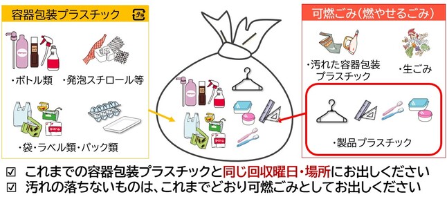 - これまでの容器包装プラスチックに加えて、プラスチックだけでできているもの(製品プラスチック)も同じ袋で回収します。