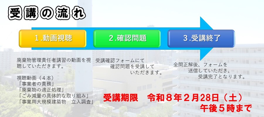 事業用大規模建築物の廃棄物管理責任者に対して行う講習です。