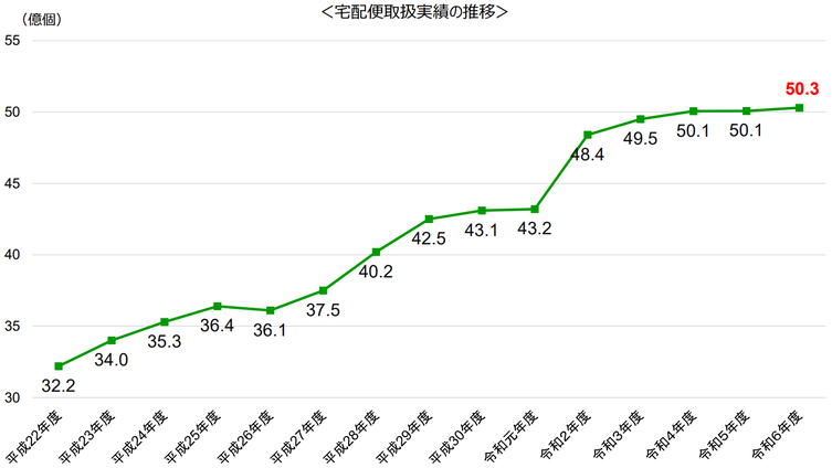 近年、インターネット通販等の利用が急速に拡大し、令和6年度の宅配便は約50億個、国民一人当たりで年間約40個の利用となっています。