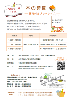 男女共同参画センターえーる図書・資料室と区立図書館では、子育て中の保護者を対象に「保育付きブックタイム-本の時間-」を実施しています。