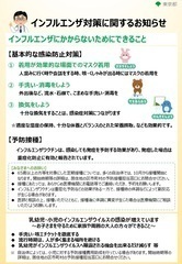 インフルエンザの予防、拡大防止のために、引き続き、こまめな手洗い、手指消毒、咳エチケット等の基本的な感染予防策を一人ひとりが心がけてください。体調管理に十分に気をつけ、感染が疑われる場合には早めに医療機関を受診しましょう。