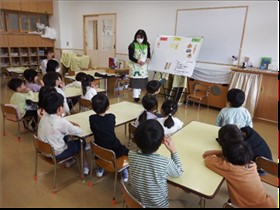 幼児クラスは毎月、看護師が「健康教育」を行っています。生活リズムの大切さや風邪予防などのお話をしています。又、用務員や調理師も「環境学習」「食育」を行い、全職員が様々な立場から、子どもたちの興味、関心の芽を育んでいます。